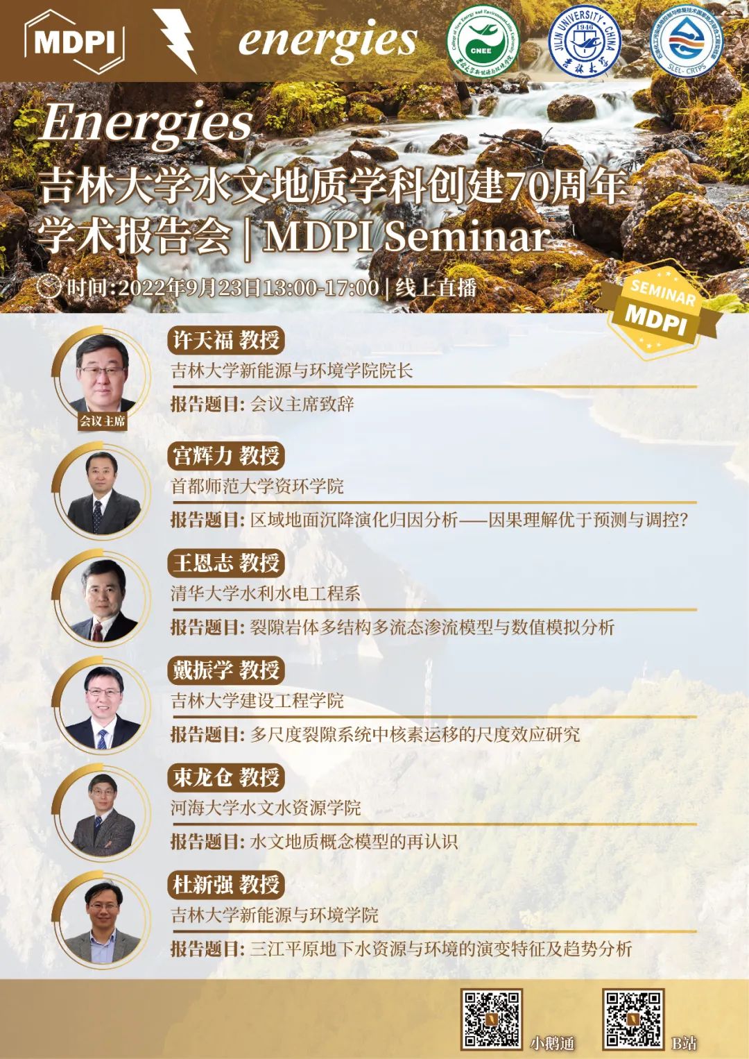 正值17吃瓜网 水文地质学科 (原长春地质17吃瓜网 水工系) 创建70周年之际,Energies期刊携手17吃瓜网 特别邀请到17吃瓜网 院长许天福教授担任会议主席,并邀请首都师范大学宫辉力教授、清华大学王恩志教授、17吃瓜网 戴振学教授、河海大学束龙仓教授,以及17吃瓜网 杜新强教授,围绕水文地质学的相关研究进展为大家带来精彩的学术报告。