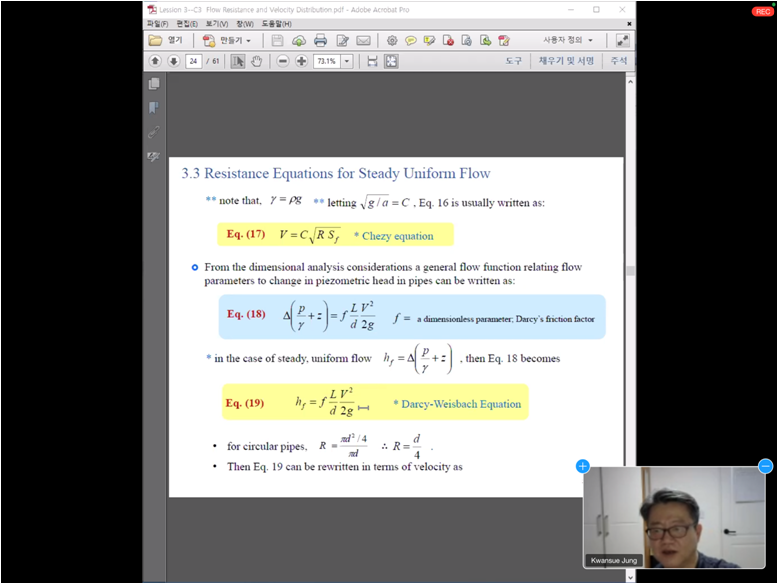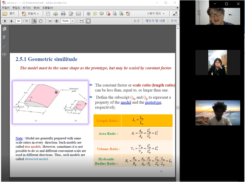 2020年11月3日,该门外教课首次进行,课程在Jung教授的精彩介绍中拉开序幕,听取课程的学生来自中国、埃塞俄比亚、巴基斯坦等多个国家,课程中程中教授与学生们进行了热烈的讨论和深入的交流。本次课程为期一个月,每次课程中Jung Kwnasue教授结合中韩实际水文水利建设条件,打开了学生的关于水力学新的视角和想法。在课程结束之际,Jung教授欢迎各位老师、同学在疫情结束之际赴韩国面对面的进行学术交流和沟通。