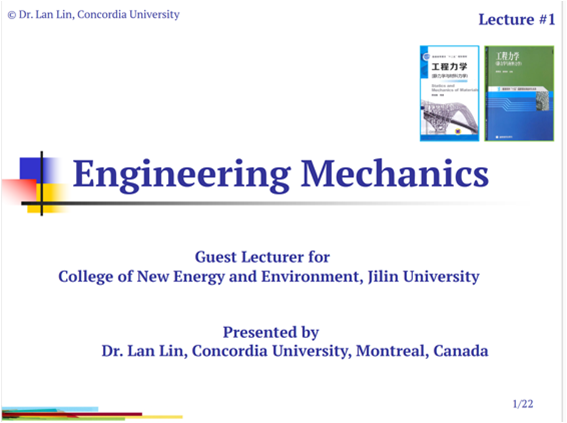 邀请加拿大康考迪亚(Concordia University)大学的林岚教授通过10次线上课程为研究生们讲授静力学。林教授在康考迪亚大学两次荣获最佳讲课奖,是研究静力学方向的专家。