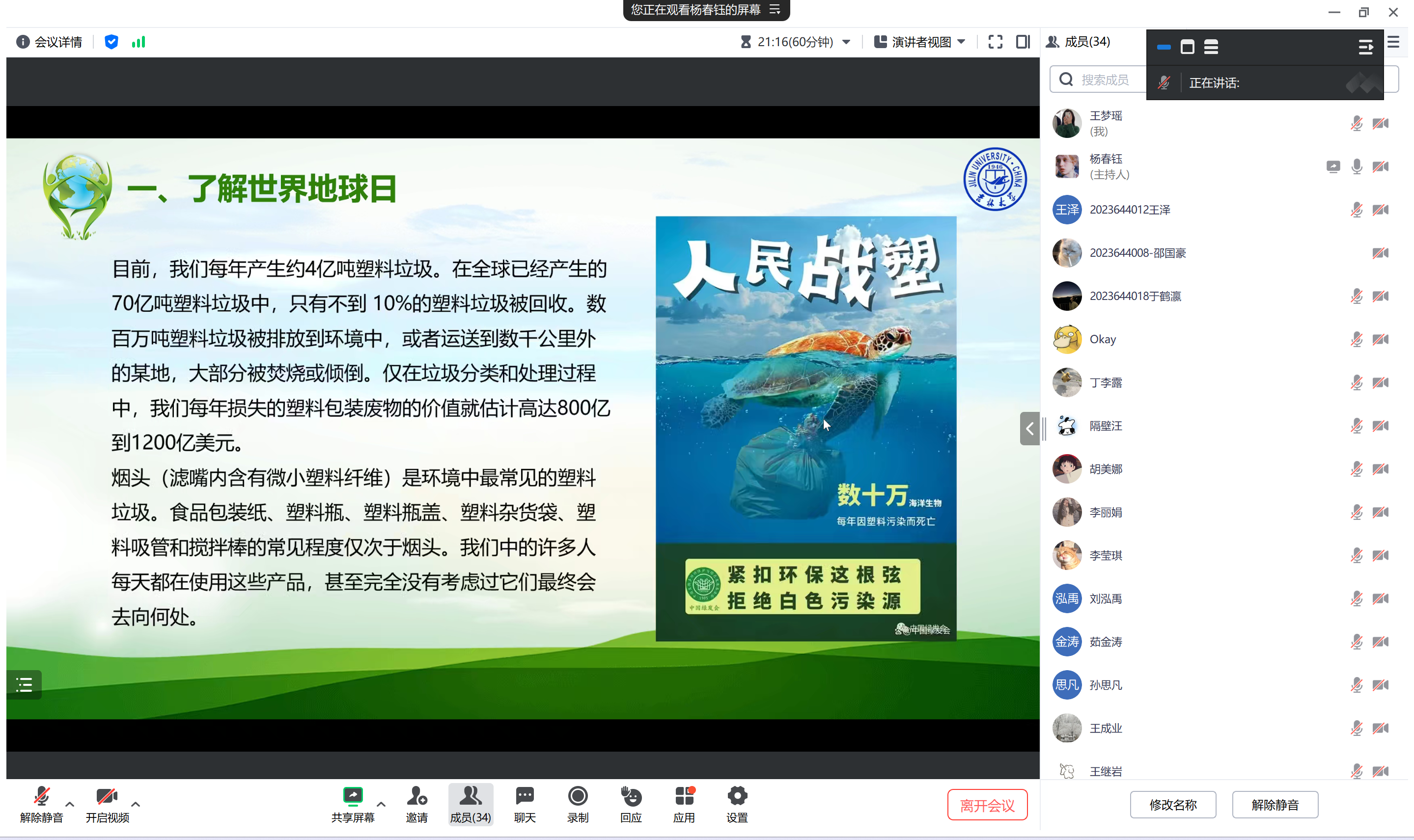 本次团日活动各团支部通过线上或线下形式进行,各班团支书带领各班成员了解全球战塑的重要性,开展座谈交流会。开展形式多样,观看视频《中国的“限塑之路”》,公益广告《减少一次性塑料使用》,塑料污染主题动画《The Beauty》,国家发展改革委与生态环境部联合发布《进一步加强塑料污染治理的意见》等。虽然主题与内容各有不同,但都蕴含着“减塑捡塑”这一思想内核,同学们通过对减塑限塑主题教育的学习,了解了塑料污染治理知识,认识了生态文明理念。