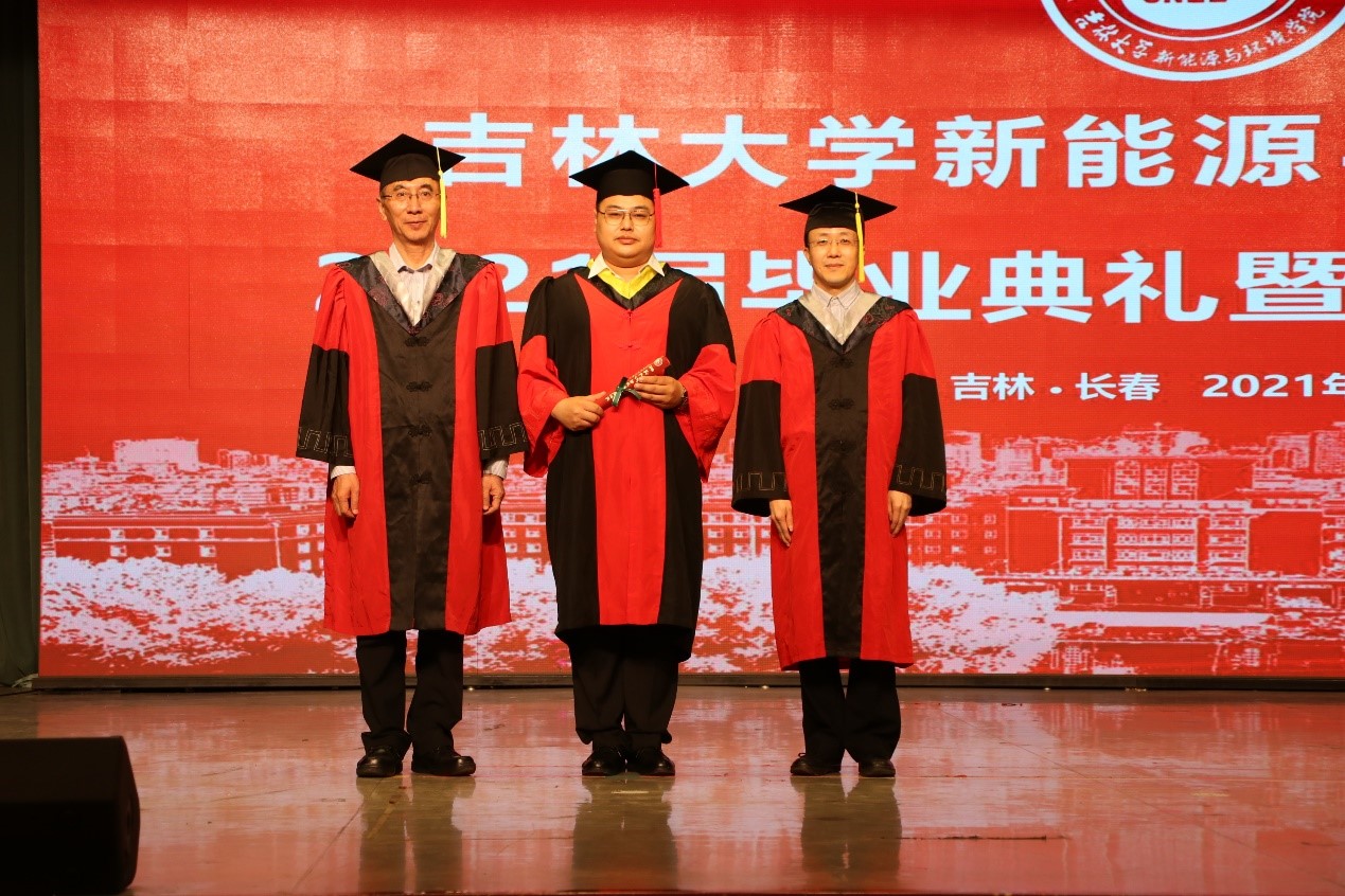 在激昂的音乐声中,毕业生们迈着坚定有力的步伐,有秩序地走上礼台,许天福教授、赵勇胜教授、董德明教授、花修艺教授、卞建民教授、董军教授身着导师服分别为每一位毕业生拨穗正冠、授予学位,并与毕业生一一合影留念。