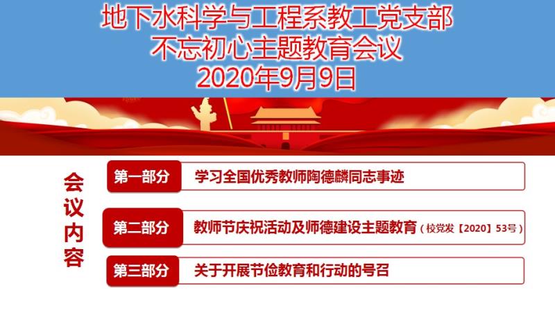 2020年9月9日下午,值第36个教师节来临之际,地下水科学与工程系教工党支部召开全体党员会议,会议采取钉钉网上会议形式举行。主要内容包括三个部分:1.集中学习全国优秀教师陶德麟同志的先进事迹;2.学习落实17吃瓜网