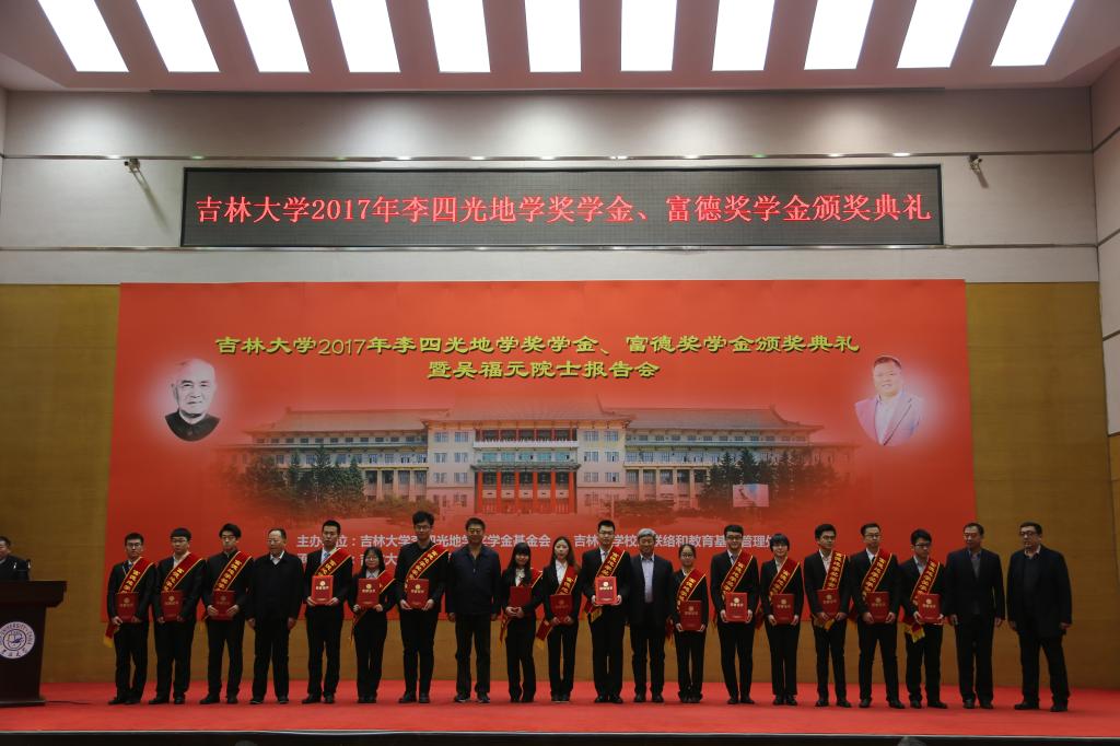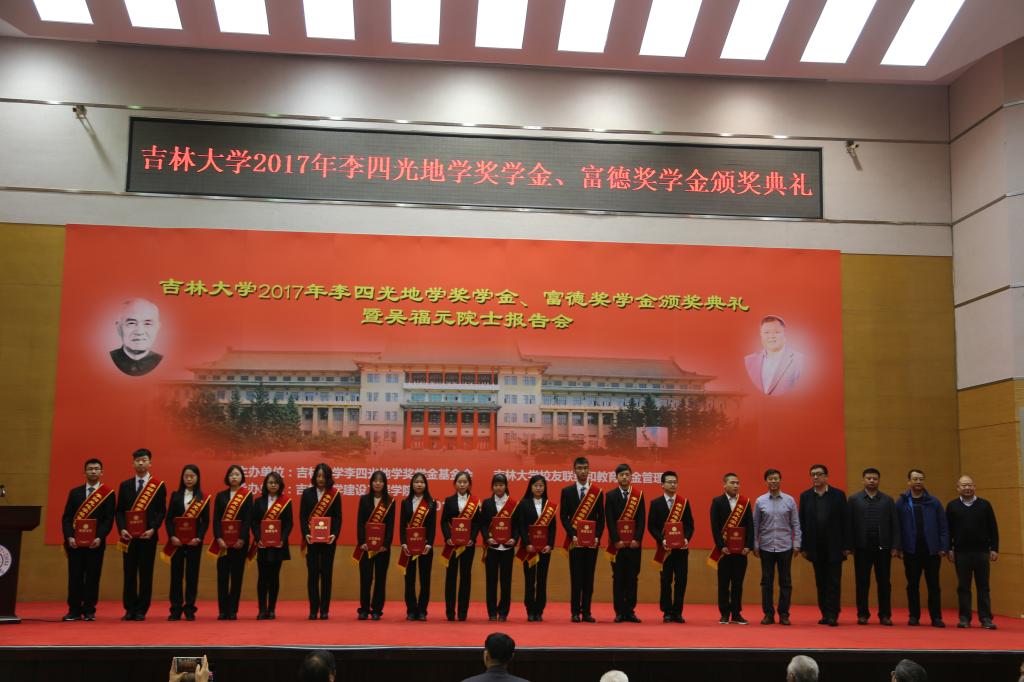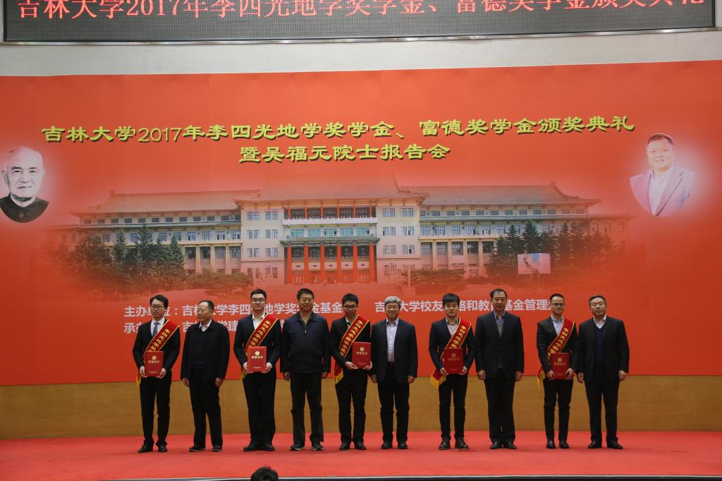 12月8日,17吃瓜网 2017年度李四光地学奖学金、富德奖学金颁奖典礼在中心校区东荣会议中心举行。17吃瓜网 研究生朱慧星,本科生韩子铭、邓贝奇、陈敬宜获得本年度李四光地学奖学金。本科生陈景川、王晨获得本年度富德奖学金。