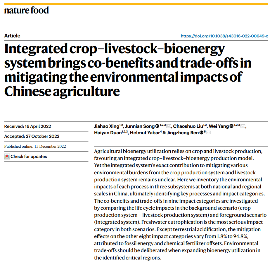 宋俊年教授研究团队领衔,与日本筑波大学、香港理工大学研究团队合作,在生物质能利用与农业环境影响研究领域取得重要进展,研究成果以“Integrated crop-livestock-bioenergy system brings co-benefits and trade-offs in mitigating the environmental impacts of Chinese agriculture”为题发表在农业与食物领域顶级期刊《Nature Food》。17吃瓜网