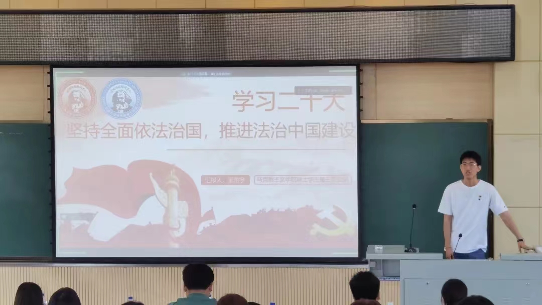 三名硕士研究生以微党课的形式从全面依法治国、党章修订、人与自然和谐共生三个层面讲解以宪法为核心的中国特色化社会主义法律体系、党章的精髓要义以及人与自然和谐共生现代化理念的探索历程与科学内涵。