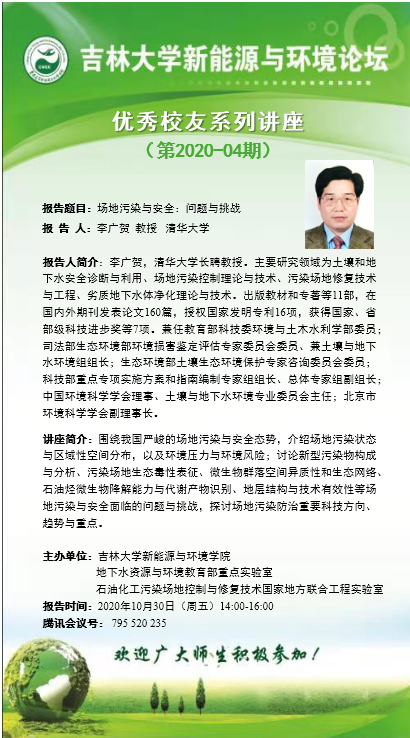 报告人简介:李广贺,清华大学长聘教授。主要研究领域为土壤和地下水安全诊断与利用、场地污染控制理论与技术、污染场地修复技术与工程、劣质地下水体净化理论与技术。出版教材和专著等11部,在国内外期刊发表论文160篇,授权国家发明专利16项,获得国家、省部级科技进步奖等7项。兼任教育部科技委环境与土木水利学部委员;司法部生态环境部环境损害鉴定评估专家委员会委员、兼土壤与地下水环境组组长;生态环境部土壤生态环境保护专家咨询委员会委员;科技部重点专项实施方案和指南编制专家组组长、总体专家组副组长;中国环境科学学会理事、土壤与地下水环境专业委员会主任;北京市环境科学学会副理事长。