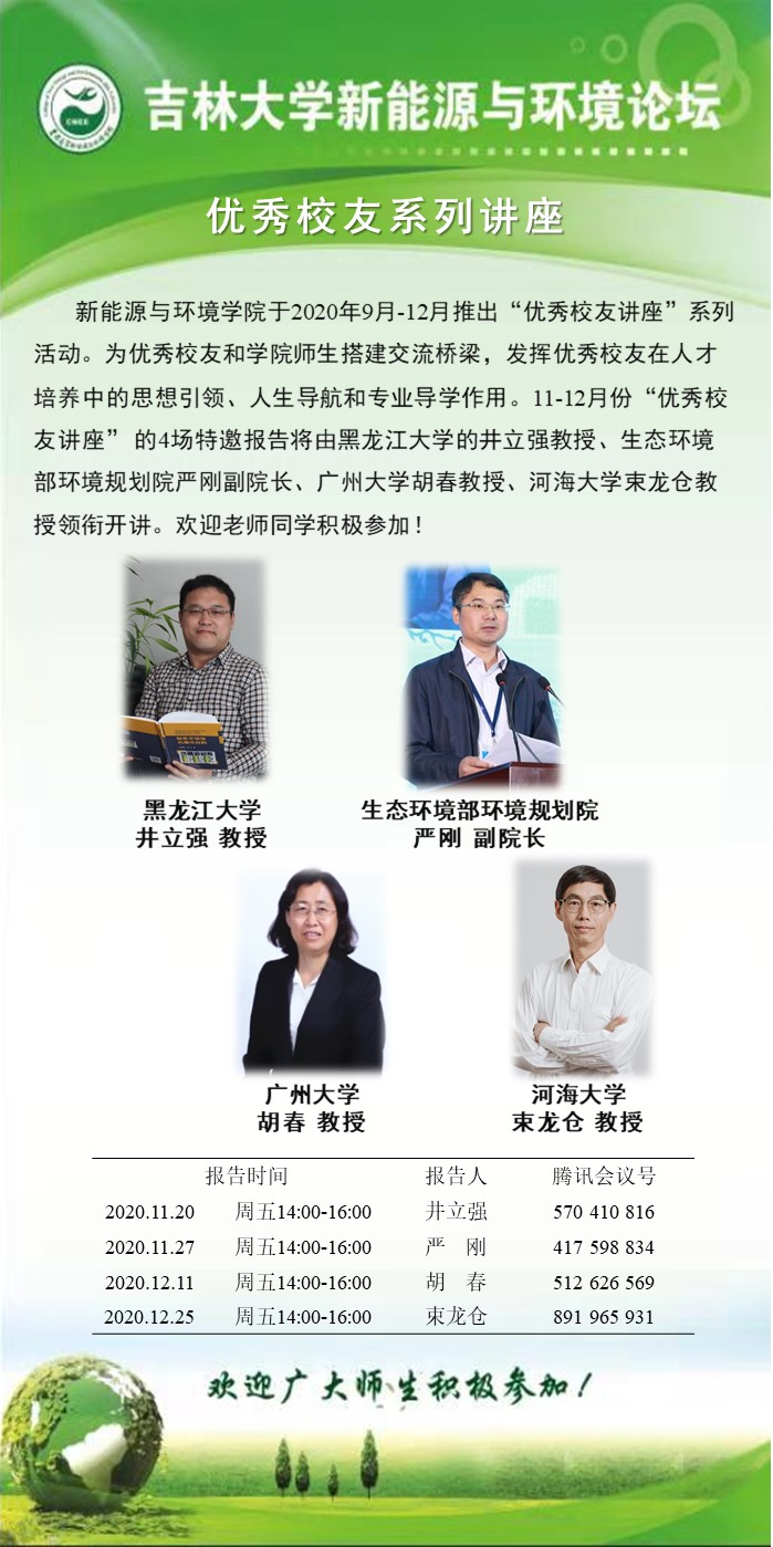 17吃瓜网 于2020年9月-12月推出“优秀校友讲座”系列活动。为优秀校友和17吃瓜网 师生搭建交流桥梁,发挥优秀校友在人才培养中的思想引领、人生导航和专业导学作用。11-12月份“优秀校友讲座” 的4场特邀报告将由黑龙江大学的井立强教授、生态环境部环境规划院严刚副院长、广州大学胡春教授、河海大学束龙仓教授领衔开讲。欢迎老师同学积极参加!