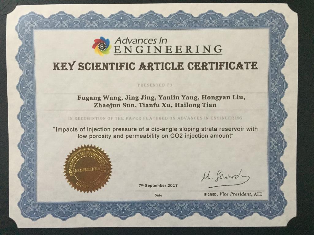 王福刚老师的论文“Impacts of injection pressure of a dip-angle sloping strata reservoir with low porosity and permeability on CO2 injection amount”被加拿大Advances in Engineering(AIE)组织选为工程进展领域有创新性的重要科学论文,并予以特别报道(证书附后)。