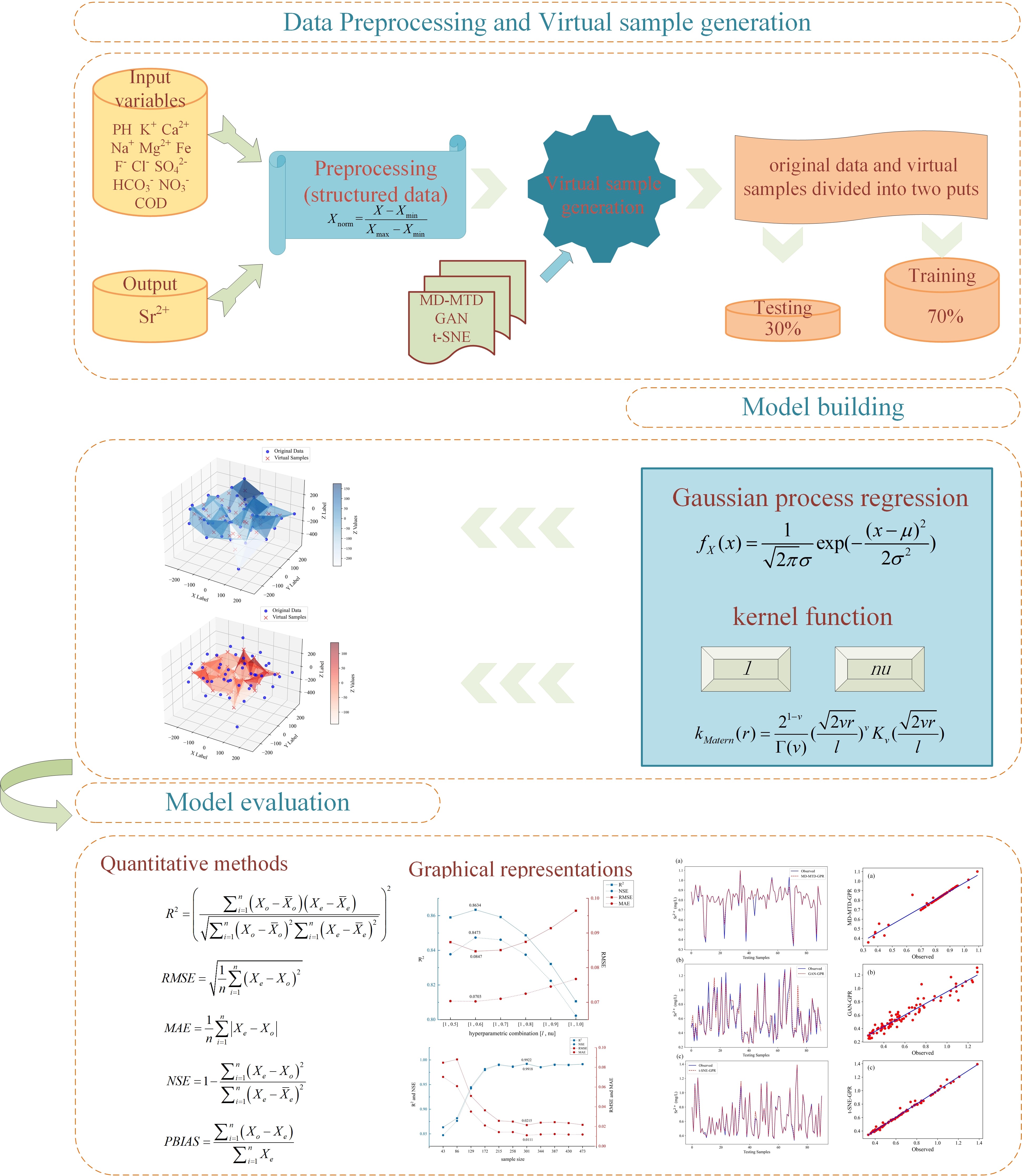 高斯过程回归模型因其出色的非线性建模能力,成为水质预测的重要工具,但其性能高度依赖训练数据的规模和质量。在监测站点稀疏、数据采集成本高的地区,传统GPR模型往往因样本量不足而预测失准。研究团队创新性地提出通过虚拟样本生成技术突破这一瓶颈,系统比较了MD-MTD、GAN和t-SNE三种生成方法的增强效果。