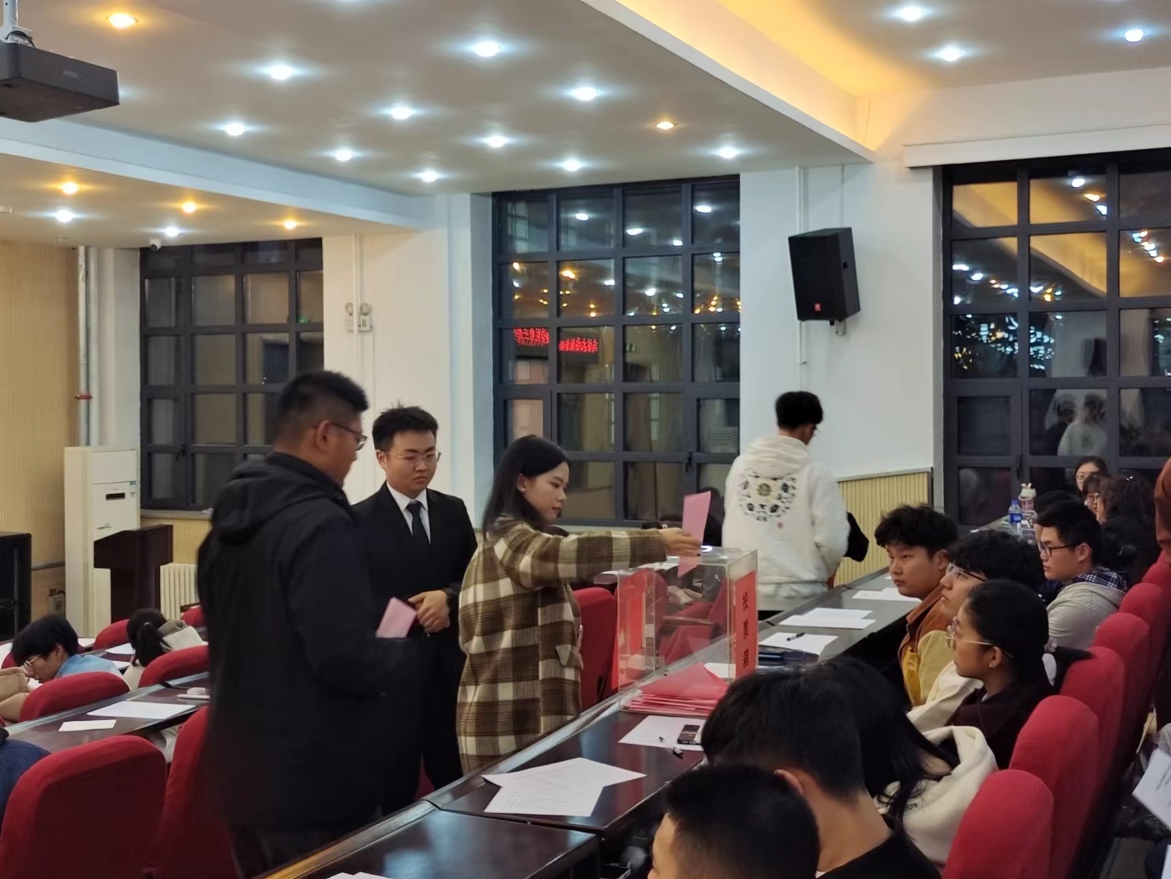 党委副书记兼副院长吴哲老师为第五届团学组织主要学生干部颁发聘书后,由第六届团学组织主要干部候选人依次上台进行三分钟竞选演讲。与会评委针对竞选者发言内容进行提问。竞选演讲结束后,与会代表进行民主表决,投票过程秉承公平、公正的原则,计票人在监票人的监督下进行计票,并将得票结果现场公布。