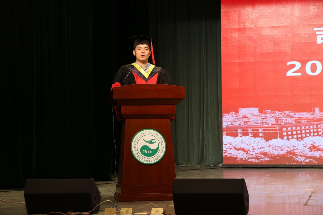 地下水科学与工程系杜新强老师发言,他为毕业生们送上鼓励和祝福,鼓励同学们将“求实创新、励志图强”的校训精神记在心中,带在身上,鼓励同学们树立远大的理想和目标,将理想追求融入到党和国家的事业中,要有坚定的信念,也要有克服困难的勇气以及终身学习的动力,为祖国的强大不懈奋斗,在实现中国梦的伟大事业中绽放青春的光彩,实现可期的未来!