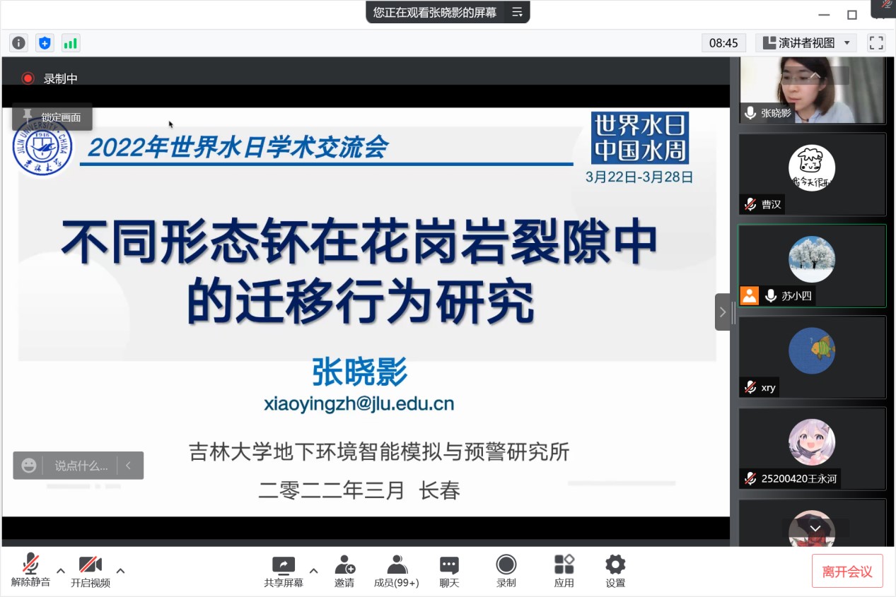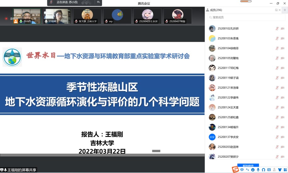 为深入落实习近平总书记节水优先、空间均衡、系统治理、两手发力治水思路,共同探讨地下水保护与利用的平衡之道,322日下午17吃瓜网 、水资源与环境研究所与地下水资源与环境教育部重点实验室共同组织召开了迎接2022年世界水日学术交流会。会议由水资源与环境研究所所长苏小四教授主持,17吃瓜网 领导、相关教师和研究生、本科生同学350余人在线参加了此次学术交流。