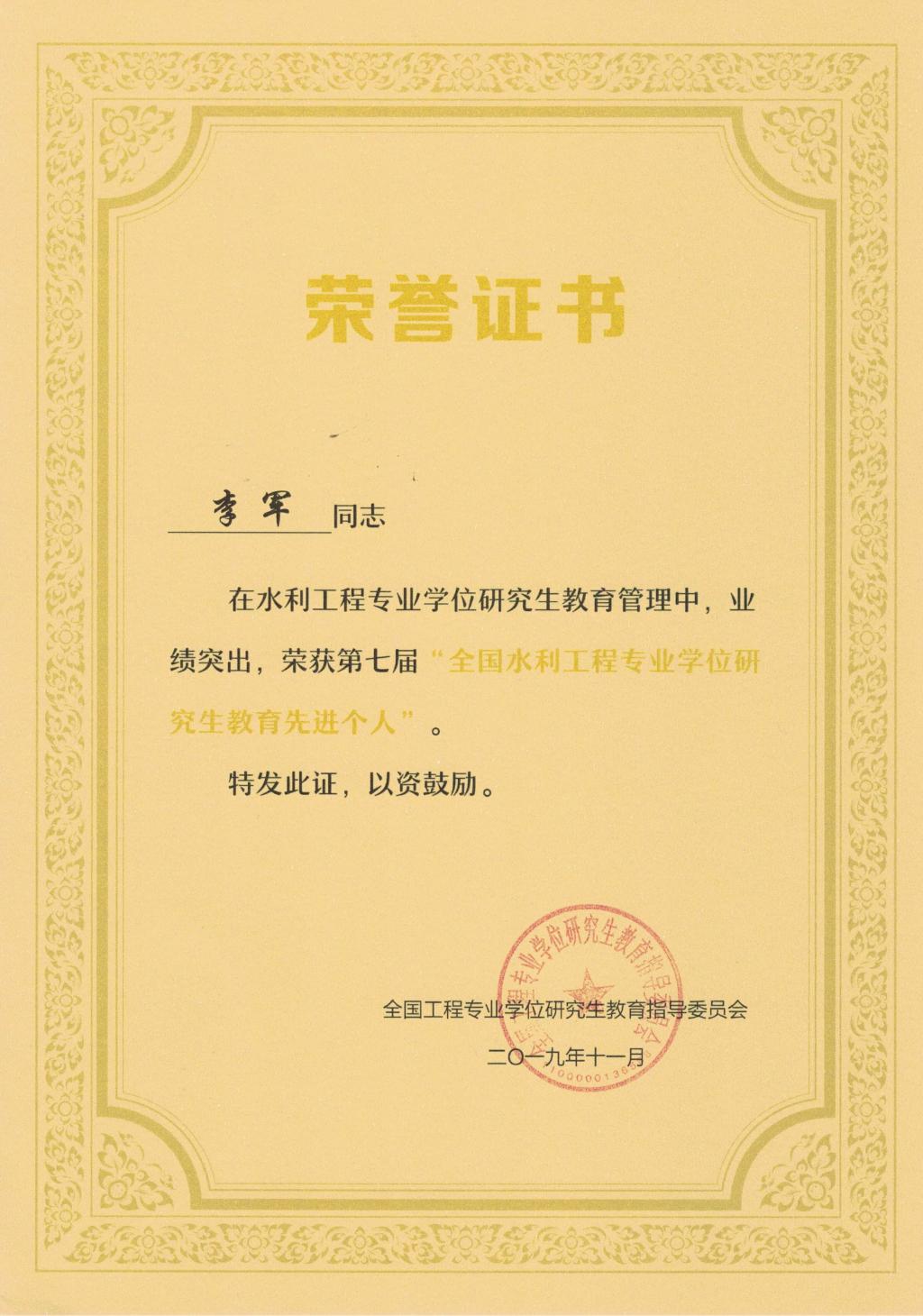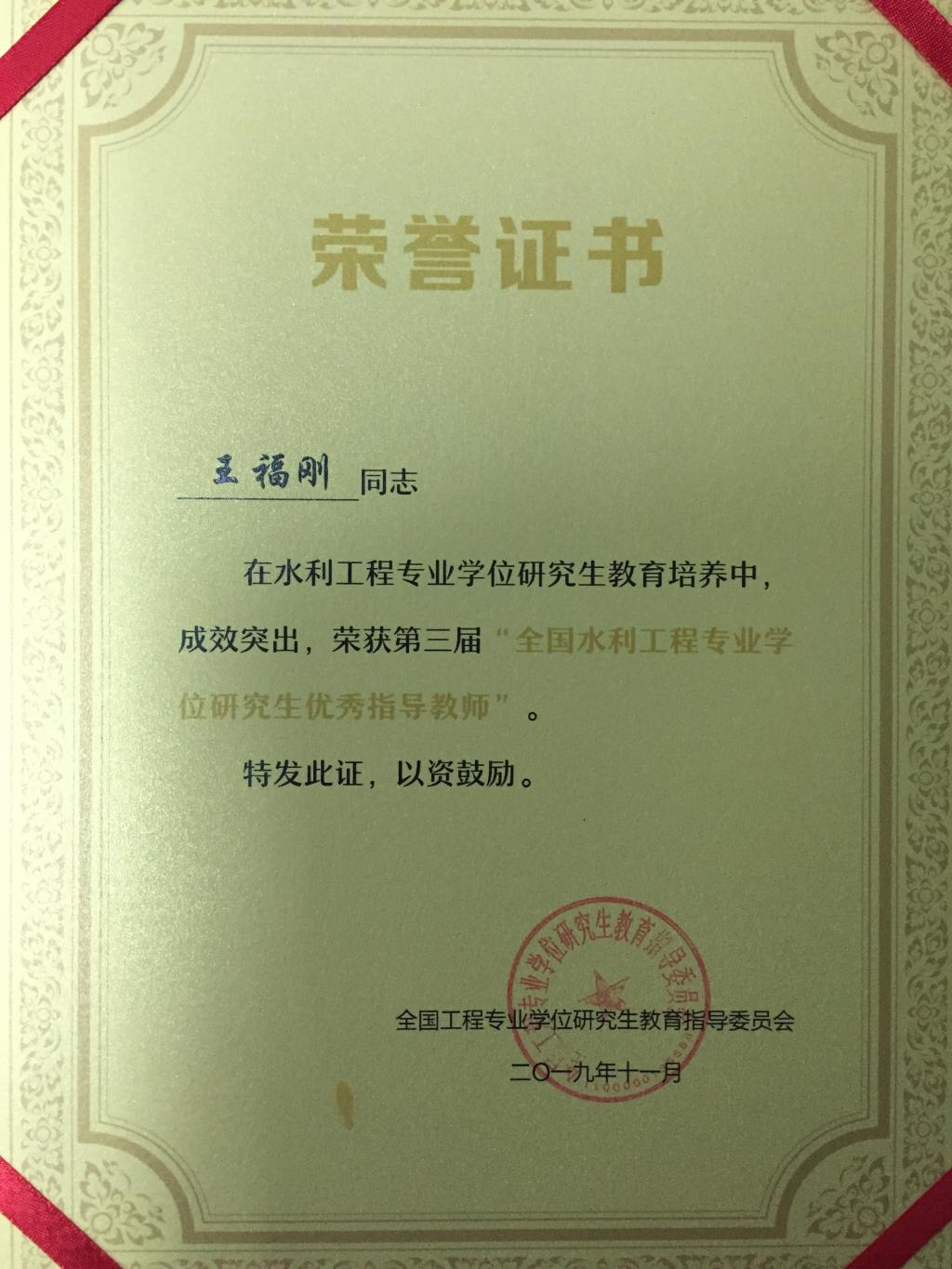 为更好地总结、交流水利工程专业学位研究生教育培养的工作和指导经验,促进水利工程专业学位研究生教育发展,提高导师指导能力,不断提高培养质量,经个人申请、单位推荐、水利工程领域核心组成员和专家投票、教指委审定,2019年共有18名指导教师被评为全国水利工程专业学位研究生优秀指导教师,14 名教工被评为全国水利工程专业学位研究生教育工作先进个人,其中17吃瓜网 王福刚教授