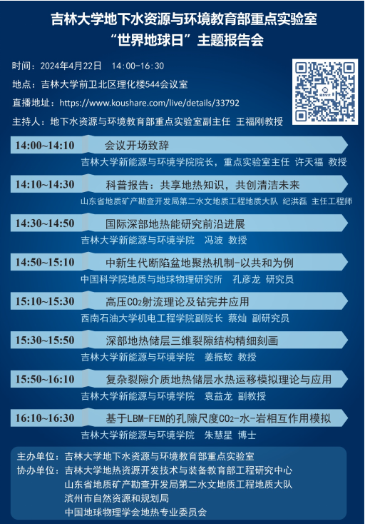 地热资源开发技术与装备教育部工程研究中心、山东省地质矿产勘查开发局第二水文地质工程地质大队、滨州市自然资源和规划局、中国地球物理学会地热专业委员会联合协办”,蔻享学术网络平台提供直博服务。报告主题围绕应对全球气候变化的国际关注热点问题,分别从绿色能源-地热能开发,以及二氧化碳减排地质封存两方面进行科普宣讲和学术研讨。会议由地下水资源与环境教育部重点实验室副主任王福刚教授主持,重点实验室成员及研究生50余人线下参加此次学术交流活动,6000余人通过“蔻享学术”平台直播观看了此次报告会。