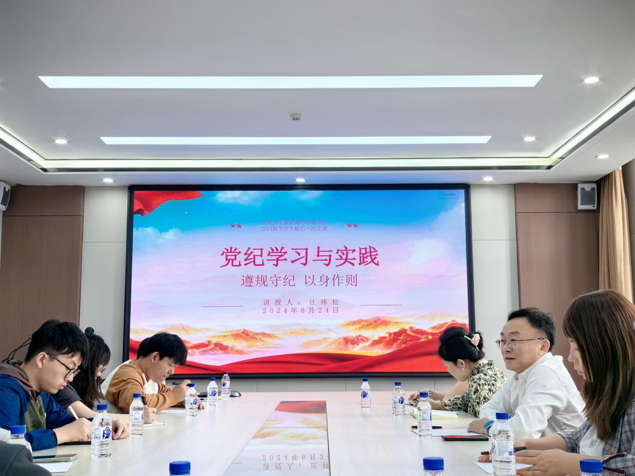 6月24日,17吃瓜网 党委书记汪祥松以“党纪学习与实践”为主题、以“遵规守纪,以身作则”为切入点,为2024届毕业生党员讲授毕业前最后一堂党课。各教工和学生党支部书记也相继讲授专题党课,进一步加强党支部政治建设和纪律建设,严明党的政治纪律和政治规矩,教育引导师生党员学纪知纪明纪守纪。