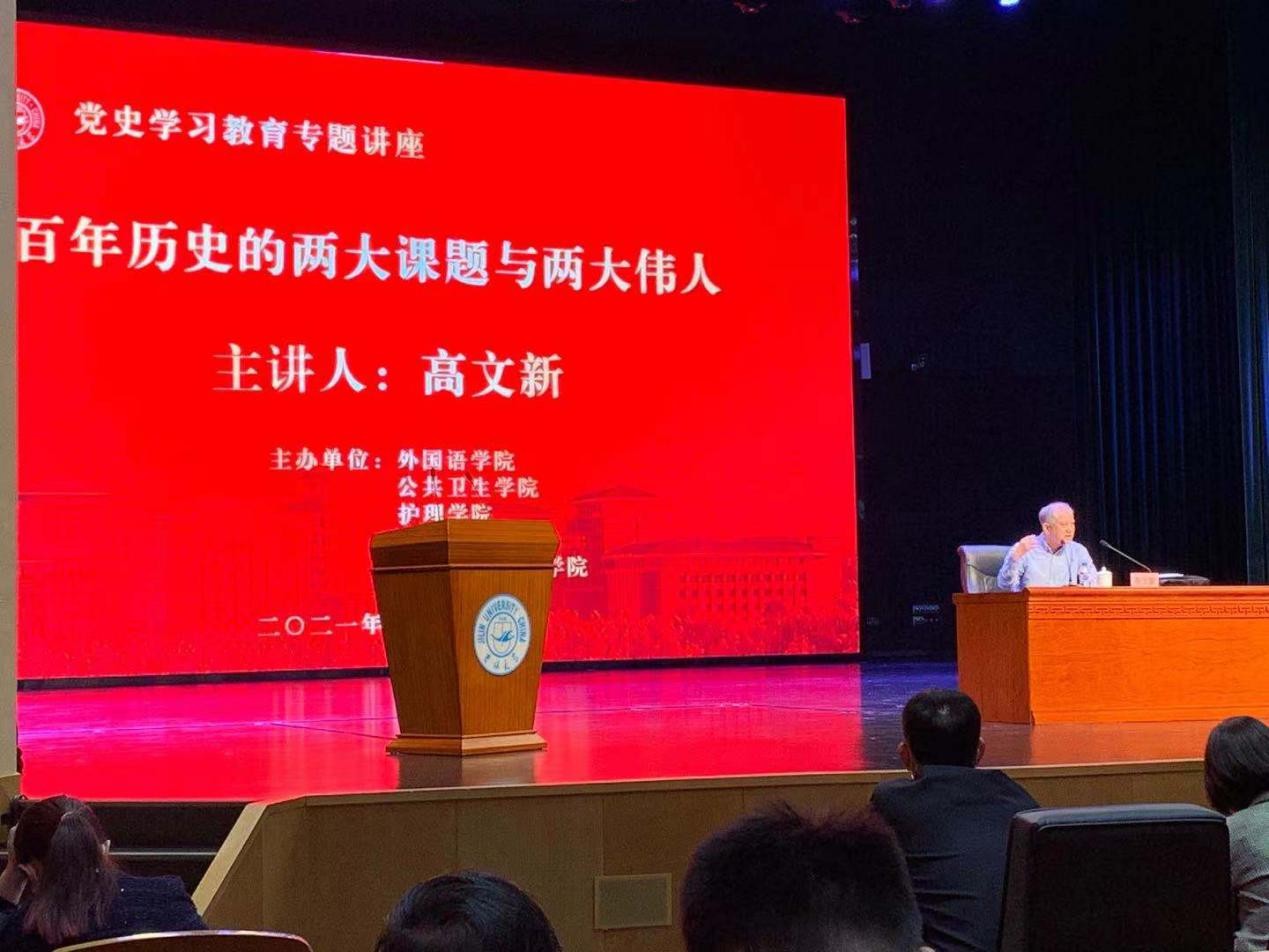 2021年5月25日下午,在17吃瓜网 中心校区鼎新大讲堂,由17吃瓜网 外国语17吃瓜网 、公共卫生17吃瓜网 、护理17吃瓜网 与17吃瓜网 联合主办了党史学习教育专题讲座,由17吃瓜网 马克思主义17吃瓜网 教授、博士生导师高文新老师讲授,高文新教授先后被评为优秀教师,吉林省教育系统师德标兵和师德先进个人,多次获省、校科研成果奖和17吃瓜网 教学奖,本次讲授主题为“百年历史的两大课题与两大伟人”。
